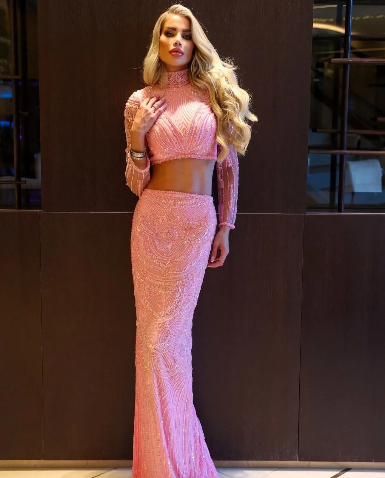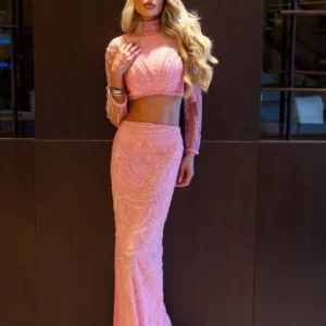 In the heart of a winter wonderland, this enchanting pink dress glows with the soft blush of dawn. Delicate sequins cascade seamlessly across its form, reflecting the twinkling lights of an opulent ballroom, crafting a dance of light and color. The meticulously contoured silhouette whispers tales of elegance and bold craftsmanship, with beadwork that traces patterns reminiscent of falling snow. Ideal for stepping into a New Year’s Eve gala or an enchanted winter soirée, this dress transforms its wearer into the soul of the festivities, a harbinger of grace amidst whispers of celebration.
